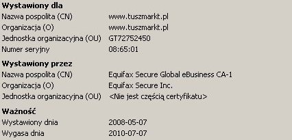 Do zabezpieczania Państwa danych przesyłanych do naszej firmy (czyli: dane osobowe, hasła) używany jest bezpieczny protokół SSL. Certyfikat SSL pozwala także na sprawdzenie tożsamości Sklepu Internetowego TUSZMARKT.PL. Wykorzystywany przez naszą firmę certyfikat jest obsługiwany przez 99% przeglądarek na rynku i pozwala na przesyłanie danych kluczem 256 - bitowym. Aby sprawdzić, czy Państwa dane są bezpieczne, prosimy o sprawdzenie czy w pasku adresowym adres internetowy zaczyna się znakami https:// i czy w prawej, dolnej części przeglądarki znajduje się zamknięta kłódka. Poniżej znajduje się screen certyfikatu.