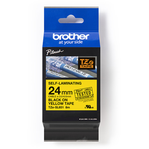 Opis produktu: Taśma Brother TZe-SL651 24mm 8m żółta taśma czarny napis samolaminująca oryginalna