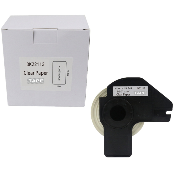 Opis produktu: Taśma do Brother DK-22113 czarny nadruk na przeźroczystym tle, 62mm x 15,24 metrów na rolce PRZEŹROCZYSTA FOLIA