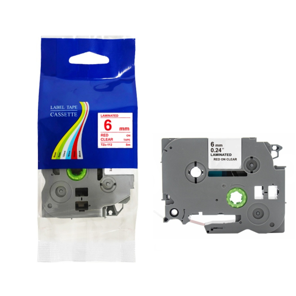 Opis produktu: Taśma do Brother TZe-112 6mm 8m przeźroczysta taśma czerwony napis