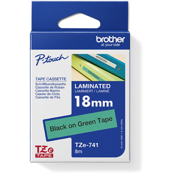 Opis produktu: Taśma do Brother TZe-741 18mm 8m zielona taśma czarny napis oryginalna