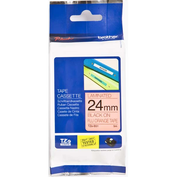 Opis produktu: Taśma do Brother TZe-B51 24mm 8m pomarańczowa taśma czarny napis fluorescencyjna oryginalna