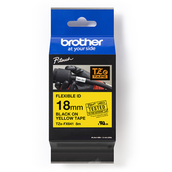 Opis produktu: Taśma do Brother TZe-FX641 18mm 8m żółta taśma czarny napis flexi elastyczna oryginalna