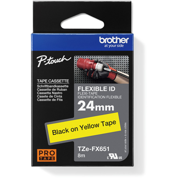 Opis produktu: Taśma do Brother TZe-FX651 24mm 8m żółta taśma czarny napis flexi elastyczna oryginalna