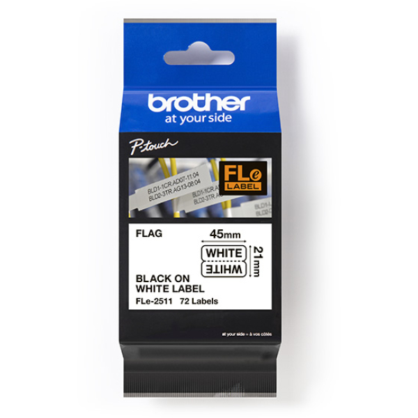 Opis produktu: Wymiarowe flagi Brother FLe-2511 45mmx21mm 72 flagi biała taśma czarny nadruk oryginalna